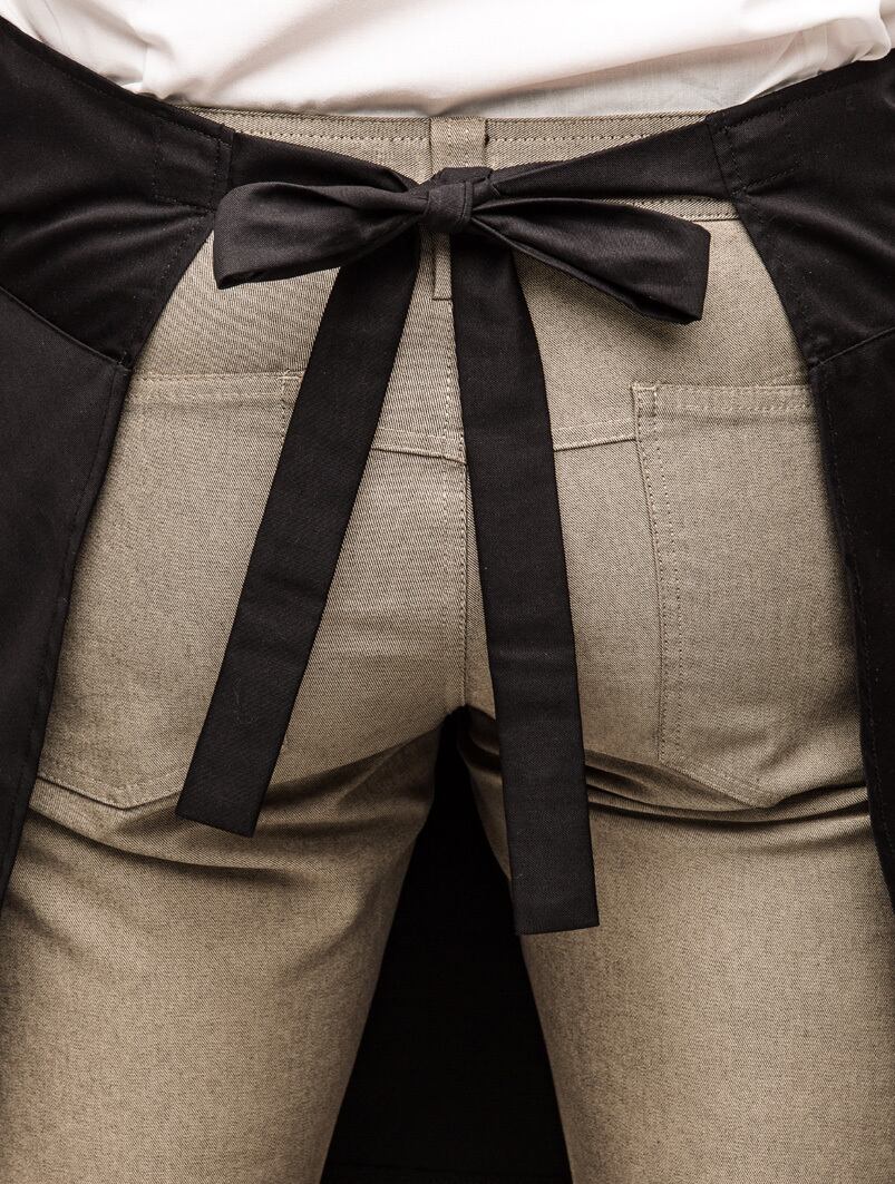 装着の際は、ネクタイの輪の部分を広げて首に通してください。ネクタイの結び目位置を調整することでエプロン部分の位置が上下しますので、男女どちらにもご着用いただけます。