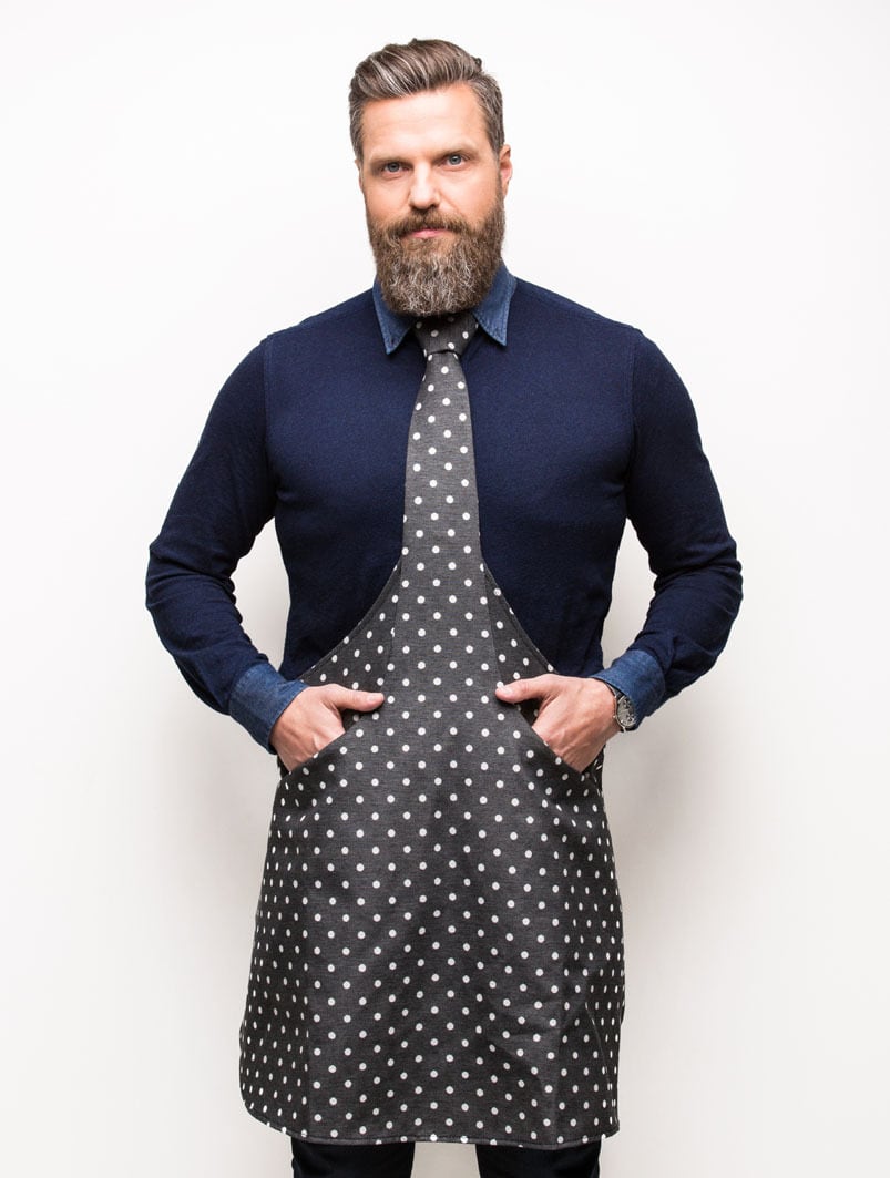 ネクタイとエプロンが一体となったデザインなので、食事中や料理の際にネクタイが揺れて汚れるという心配から解放されます。